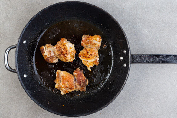 Das Fleisch in einer großen Pfanne mit 3EL Pflanzenöl bei mittlerer Hitze auf jeder Seite 4–5Min. anbraten, bis das Fleisch goldbraun und durch ist.