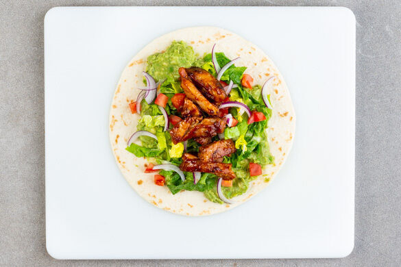 Es ist wieder Zeit für Farbe! Unsere herzhaften Wraps sind prall gefüllt mit kräftig-aromatischem Hähnchenschenkelfleisch, frisch aus der Pfanne. Die Mitspieler: Tomate, Salat, Zwiebel, Limette und natürlich cremige Guacamole. So lässt sich der Sommer genießen. ¡Viva tortilla!