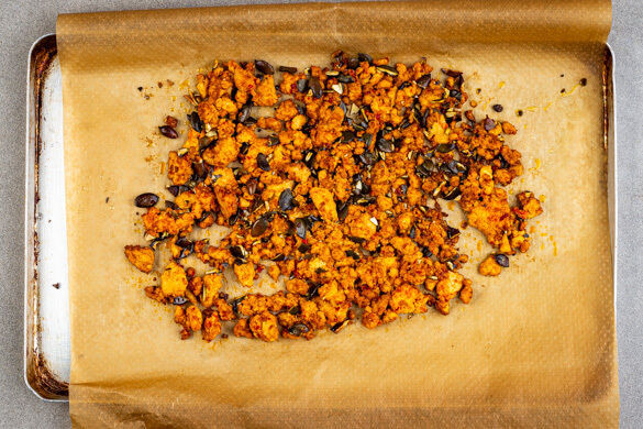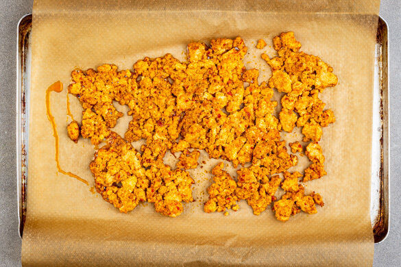 Den Tofu in ein sauberes Küchentuch wickeln und möglichst viel Flüssigkeit auspressen. Anschließend den Tofu mit den Fingern zerkrümeln, mit der ½ der Harissa, der restlichen Sojasauce, 1EL Mehl, 1EL Pflanzenöl sowie 1 Prise Salz vermengen. Auf einem mit Backpapier ausgelegten Backblech verteilen und im mittleren Teil des Ofens in ca. 14Min. knusprig backen.
