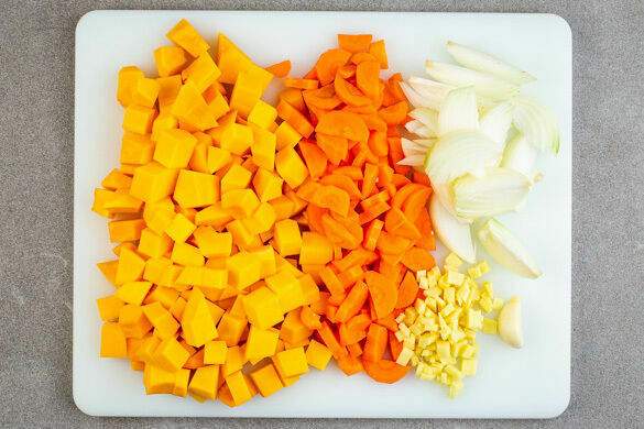 Den Backofen auf 240°C Ober-/Unterhitze vorheizen. Die Kürbisse halbieren und mit einem Löffel die Kerne entfernen, dann in 1–2cm große Stücke schneiden. Die Karotten ggf. schälen, längs halbieren und quer in dünne Scheiben schneiden. Die Zwiebeln schälen, halbieren und in dünne Spalten schneiden. Den Ingwer schälen und grob würfeln, den Knoblauch schälen.