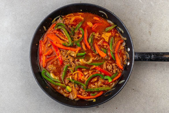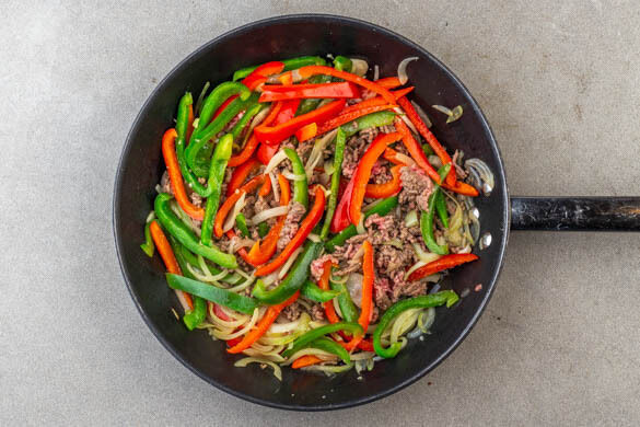 Das Hackfleisch in die Pfanne geben, mit je ½TL Salz und Pfeffer würzen und in 3–4Min. krümelig anbraten. Dann die Hitze erhöhen und in 5–7Min. weiterbraten, bis die Paprikastreifen weich werden.
