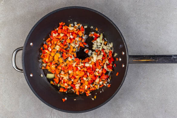 Die Zwiebeln und die Paprika in einer großen Pfanne mit 4EL Pflanzenöl bei mittlerer Hitze 5–7Min. braten, bis die Paprika weich und die Zwiebeln glasig sind.
