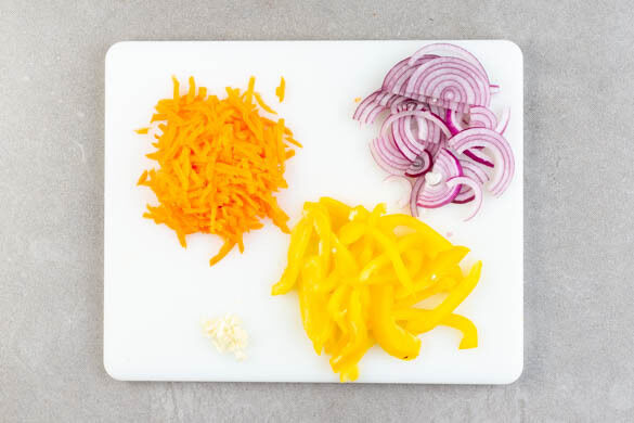 Die Zwiebeln schälen, halbieren und in feine Streifen schneiden. Den Knoblauch schälen und fein würfeln. Die Paprika vierteln und entkernen, dann in dünne, lange Streifen schneiden. Die Karotten ggf. schälen und mit einer Küchenreibe grob raspeln.