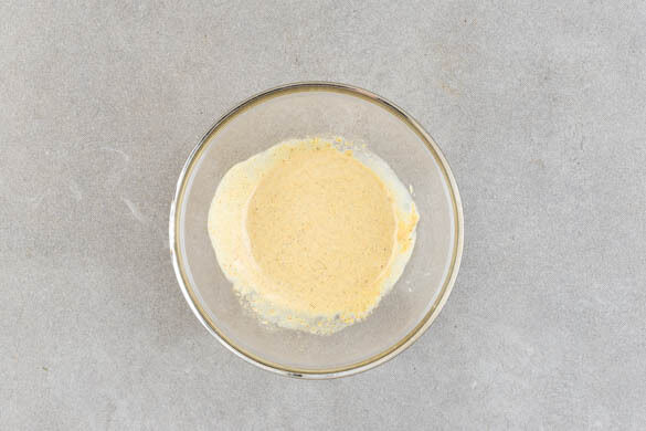 Den Backofen auf 220°C (200°C Umluft) vorheizen. Die Gurke in dünne Scheiben schneiden. 2EL Mayonnaise mit 1EL Essig sowie je 1 kräftigen Prise Salz und Zucker verrühren, dann mit den Gurken vermengen. Mit Pfeffer und ggf. mehr Salz abschmecken.
