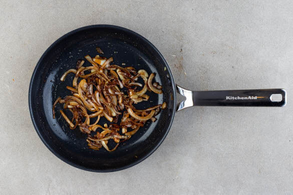 Den Backofen auf 240°C (220ºC Umluft) vorheizen. Die Zwiebeln schälen, halbieren und in ca. 0,5cm breite Spalten schneiden. In einer großen Pfanne mit 2EL Olivenöl und 1 kräftigen Prise Salz bei mittlerer Hitze in ca. 10Min. goldbraun und weich braten. Mit 2EL Balsamicoessig ablöschen und 2–5Min. einköcheln lassen.