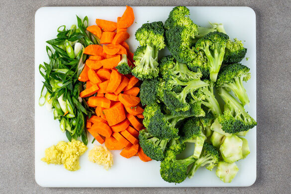 Die Lauchzwiebeln schräg in feine Ringe schneiden. Die Karotte ggf. schälen, längs halbieren und quer in dünne Scheiben schneiden. Den Brokkoli in mundgerechte Röschen schneiden, die unteren 1–2cm des Strunks abschneiden, den restlichen Strunk ggf. schälen und in dünne Scheiben schneiden.