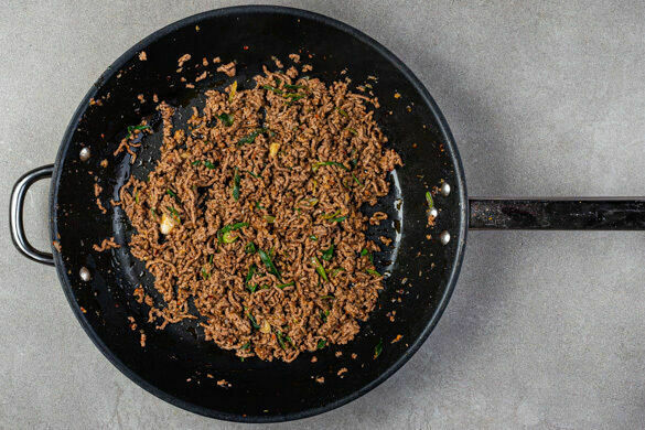 Etwas Lauchzwiebelgrün für die Garnitur beiseitelegen. Die übrigen Lauchzwiebeln, die Knoblauch-Ingwer-Paste und die Chiliflocken nach Geschmack in einer großen Pfanne oder einem Wok mit 2EL Pflanzenöl bei starker Hitze ca. 1Min. anbraten. Das Hackfleisch hinzufügen und 2–3Min. mitbraten, bis es braun und ein Großteil der Flüssigkeit verdampft ist.