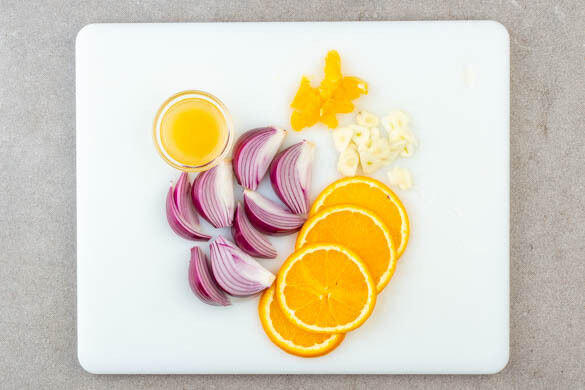 Den Backofen auf 240°C (220°C Umluft) vorheizen. Den Knoblauch schälen und in dünne Scheibchen schneiden. Die Zwiebel schälen und in Spalten schneiden. Die Orange halbieren und eine Hälfte in dünne Scheiben schneiden. Die übrige Orangenhälfte halbieren und eine Hälfte auspressen, die andere Hälfte schälen und das Fruchtfleisch in kleine Würfel schneiden.