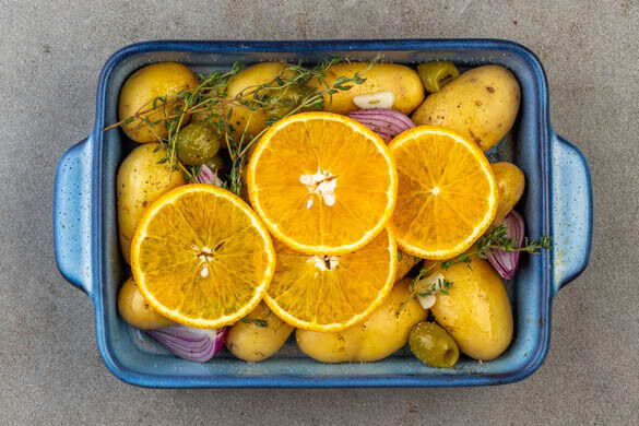 Die Kartoffeln, die Oliven, die ½ der Zwiebeln, die ½ des Knoblauchs und die ½ der Thymianzweige in einer mittelgroßen Auflaufform mit 1EL Olivenöl und je 1 Prise Salz und Pfeffer vermengen und die Orangenscheiben darauf verteilen.