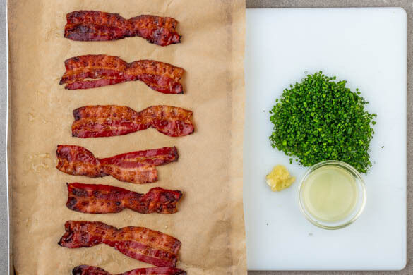 Den Backofen auf 240°C (220°C Umluft) vorheizen. Den Knoblauch schälen und durch eine Knoblauchpresse drücken oder sehr fein würfeln. Den Schnittlauch in kleine Röllchen schneiden. Die Zitronenschale fein abreiben, dann die Zitronen halbieren und auspressen. Den Bacon auf einem mit Backpapier ausgelegten Blech verteilen und in 10–13Min. im Ofen knusprig backen.