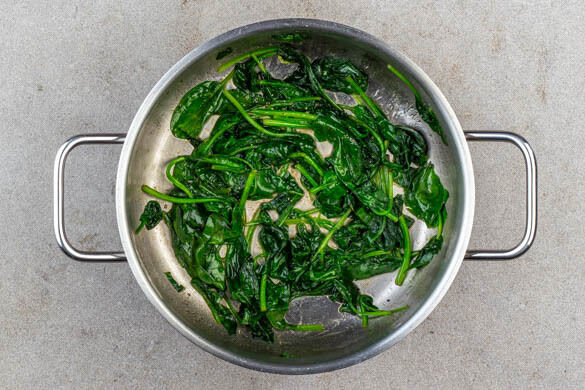 1EL Butter in einem mittelgroßen Topf bei mittlerer Hitze schmelzen. Den Knoblauch hinzugeben und ca. 30Sek. anbraten, dann den Spinat ggf. portionsweise zugeben und zusammenfallen lassen. 1EL Zitronensaft und je 1 Prise Salz und Pfeffer unterrühren, probieren und ggf. mit mehr Salz und Pfeffer nachwürzen. Vom Herd nehmen und abgedeckt beiseitestellen.