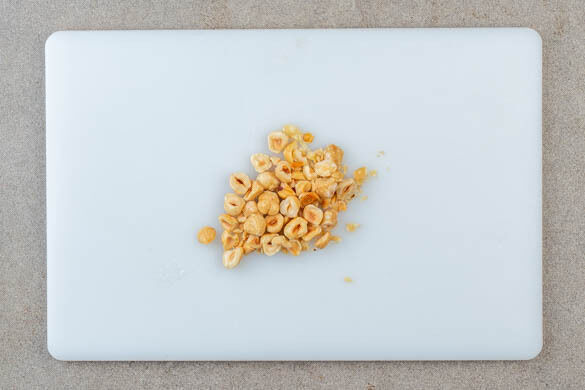 Den Backofen auf 200°C (180°C Umluft) vorheizen. Eine mittelgroße Auflaufform mit 1EL Butter einfetten und beiseitestellen. Die Haselnüsse grob hacken.