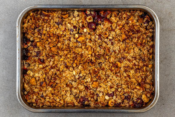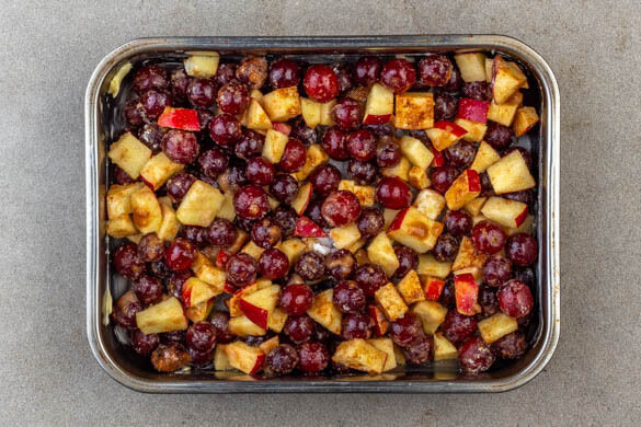 Das Obst gleichmäßig mit den Streuseln bedecken. Den Crumble 35–45Min. im Ofen backen, bis der Obstsaft an den Rändern der Form blubbert und die Streusel sich fest anfühlen.