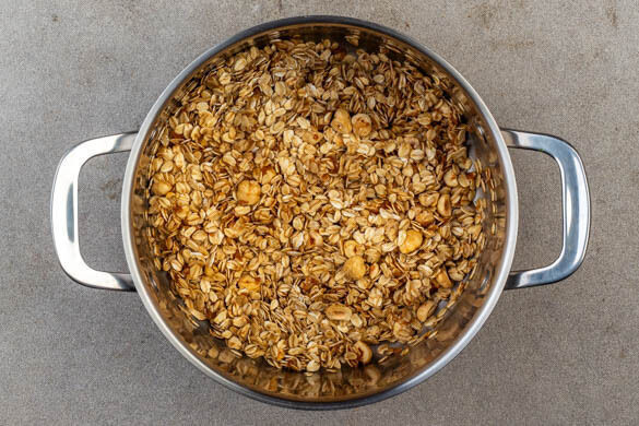 75g Butter in einem mittelgroßen Topf bei mittlerer Hitze schmelzen. Den restlichen Zucker, das restliche Spekulatiusgewürz und 1 kräftige Prise Salz einrühren, bis sich der Zucker auflöst. Den Topf vom Herd nehmen, dann die Haferflocken und die Haselnüsse unterrühren.