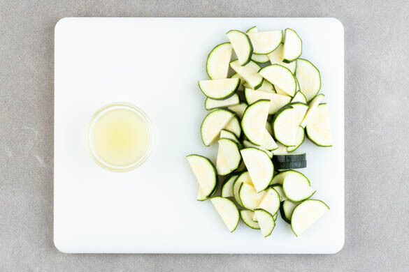 In einem mittelgroßen Topf ausreichend gesalzenes Wasser für die Pasta zum Kochen bringen. Die Zucchini längs halbieren und in ca. 1cm dicke Scheiben schneiden. Die Zitrone halbieren und auspressen.