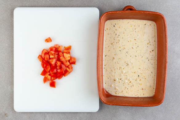 Die Tomaten grob würfeln. Den Boden einer großen Auflaufform mit ¼ der Sauce bedecken.