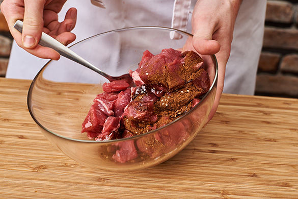 Das Fleisch mit etwas Küchenkrepp trocken tupfen und mit der 1/2 der Gewürzmischung sowie 1–2EL Pflanzenöl vermengen.