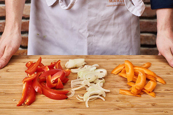 Die Paprika vierteln, entkernen und in dünne Streifen schneiden. Die Karotte schälen und schräg in dünne Scheiben schneiden. Die Zwiebeln schälen, halbieren und in feine Streifen schneiden.