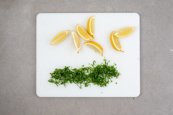 Die Petersilienblätter von den Stängeln zupfen und fein hacken. Die Zitrone in Spalten schneiden, 1 Spalte auspressen.