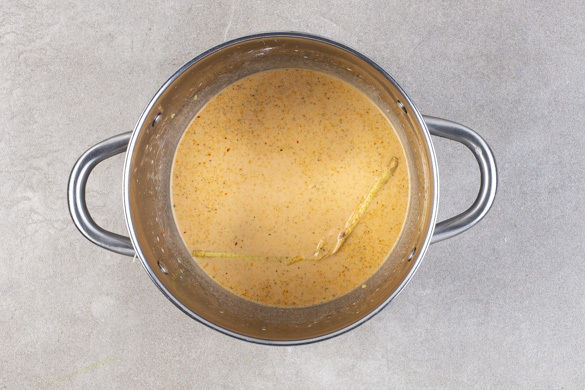 Den Ingwer, den Knoblauch und das Zitronengras in einem großen Topf mit 1EL Pflanzenöl bei mittlerer Hitze 1–2Min. anschwitzen. Die 1/2 der Currypaste oder mehr nach Geschmack unterrühren. Mit 1–2EL Mehl bestäuben und mit der Kokosmilch und 150–200ml Wasser ablöschen. Das Brühgewürz hinzufügen und das Curry 5–6Min. sanft köcheln lassen.