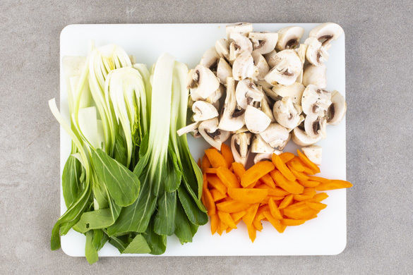 In einem mittelgroßen Topf 400ml leicht gesalzenes Wasser für den Reis zum Kochen bringen. Das Ende vom Pak Choi dünn abschneiden und den Pak Choi längs in ca. 2cm breite Streifen schneiden. Die Pilze ggf. mit etwas Küchenkrepp oder einer Bürste säubern und je nach Größe vierteln oder sechsteln. Die Karotte schälen, längs halbieren und schräg in dünne Scheiben schneiden.