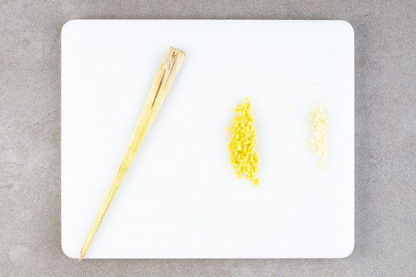 Den Ingwer und den Knoblauch schälen und in feine Würfel schneiden. Das Zitronengras mit einem Messerrücken rundum leicht platt klopfen.