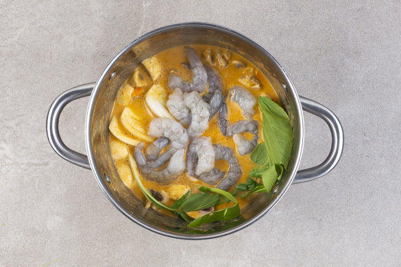 Den Ingwer, den Knoblauch und das Zitronengras in einem großen Topf mit 1EL Pflanzenöl bei mittlerer Hitze 1–2Min. anschwitzen. Die 1/2 der Currypaste oder mehr nach Geschmack unterrühren. Mit 1–2EL Mehl bestäuben und mit der Kokosmilch und 250–300ml Wasser ablöschen. Das Brühgewürz hinzufügen und das Curry 5–6Min. sanft köcheln lassen.