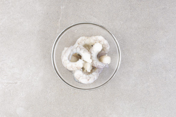 Die Garnelen in einem Sieb mit kaltem Wasser abspülen und mit Küchenkrepp trocken tupfen. Ggf. vom Darm befreien.