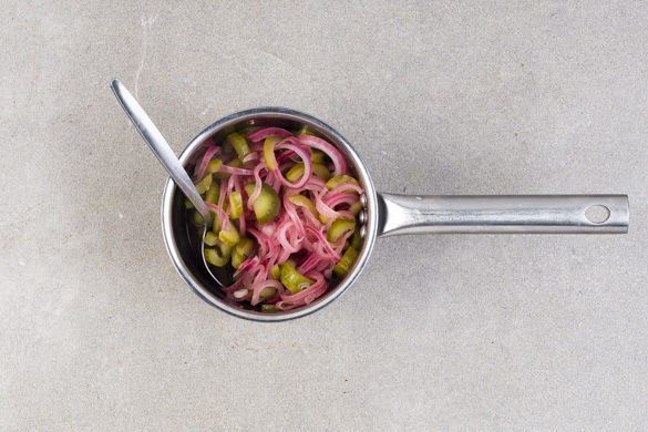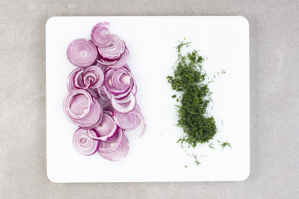 Die Zwiebeln schälen und in dünne Ringe schneiden. Die Dillspitzen abzupfen und fein schneiden.