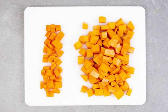 Die Süßkartoffel schälen und in ca. 1cm große Würfel schneiden. Die Karotten schälen und in 0,5–1cm große Stücke schneiden.