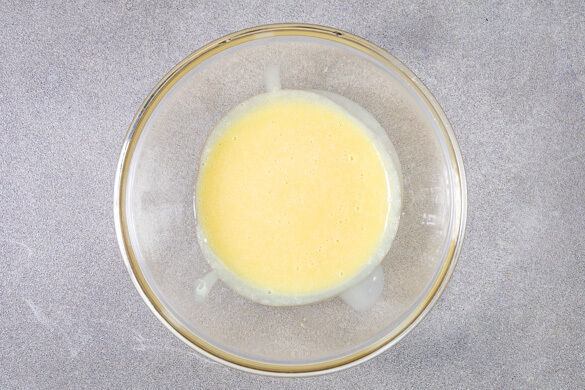 Die Eier mit 250ml Milch und 2EL Zucker verquirlen. Dann das Mehl langsam und portionsweise unterrühren. Tipp: Am besten in 3 Portionen unterrühren und nach jedem Mal gründlich vermengen. ½TL Salz unterrühren und den Teig ca. 5Min. ruhen lassen.