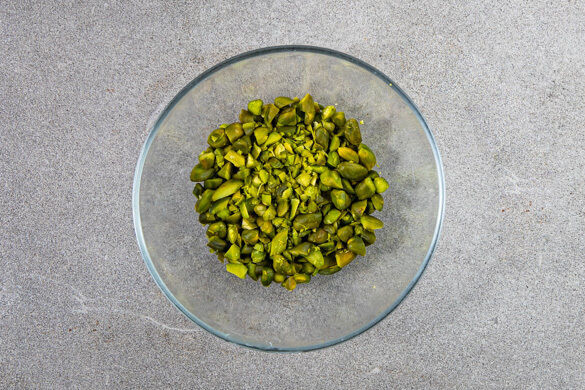 Die Pistazien grob hacken. Tipp: Wer möchte, kann die Pistazien kurz anrösten. Das Kompott vom Herd nehmen, mit 1 Prise Salz verfeinern und 2EL Butter unterrühren. Die Crêpes auf Teller verteilen, nach Belieben aufrollen oder falten, mit dem Kompott und der Crème fraîche anrichten und mit den Pistazien garniert servieren.