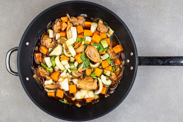 Wir haben es mal wieder geschafft: Wir bringen authentische Thai-Küche zu dir nach Hause und zwar ohne großen Aufwand, aber dafür mit extra viel „Mmmh“! In deiner Pfanne brätst du erst das zarte Hähnchenschenkelfilet an, dann gesellen sich Süßkartoffelwürfel, Knoblauch und Pak Choi dazu. Für die richtige Würze sorgen Soja- und Fischsauce. Feine Chilistreifen, Thai-Basilikum und Limette machen das Gaumenglück komplett!