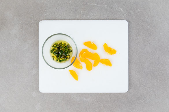 Die Orangenschale abreiben, dann die Orangen filetieren: Dafür mit einem scharfen Messer die restliche Schale mit der weißen Haut wegschneiden und die einzelnen Filets zwischen den Fruchtwänden herausschneiden, dabei den Saft auffangen. Den Saft mit 2EL Olivenöl, 1EL Essig, dem Knoblauch, der 1/2 der Minze und Orangenschale nach Geschmack verrühren.