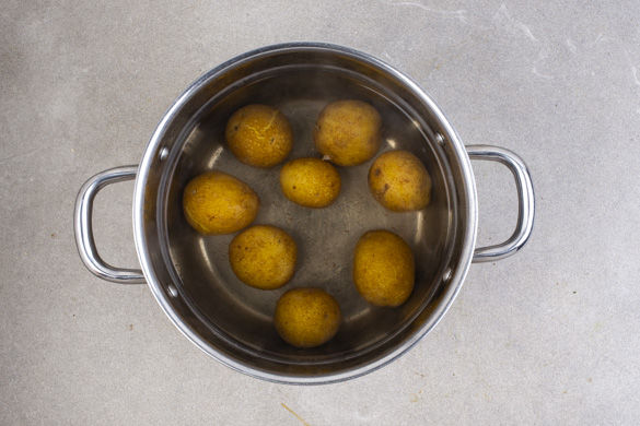 Den Backofen auf 220°C Umluft (240°C Ober-/Unterhitze) vorheizen. In einem mittelgroßen Topf ausreichend gesalzenes Wasser für die Kartoffeln zum Kochen bringen. Die Kartoffeln samt Schale 10Min. vorkochen und anschließend in ein Sieb abgießen. Sie sollen noch nicht gar gekocht werden.