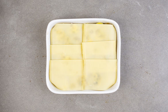 Die Kartoffeln in dünne Scheiben schneiden. Tipp: Wenn die Kartoffeln noch zu heiß sind, diese mit Küchenkrepp „anfassen“. Eine Auflaufform mit 1–2EL Olivenöl fetten und das Gemüse hineinschichten: Mit einer Schicht Kartoffeln beginnen, darauf etwas Pilzsauce verstreichen und mit Kartoffeln bedecken. So weiterschichten, bis alles verbraucht ist.