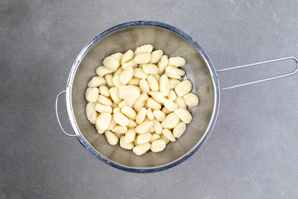 Die Gnocchi in einen mittelgroßen Topf geben, mit dem kochenden Wasser übergießen und 3–4Min. ohne Hitzezufuhr ziehen lassen. In ein Sieb abgießen und beiseitestellen. Die Kürbiskerne in einer großen Pfanne ohne Zugabe von Fett anrösten, mit etwas Salz würzen und aus der Pfanne nehmen.