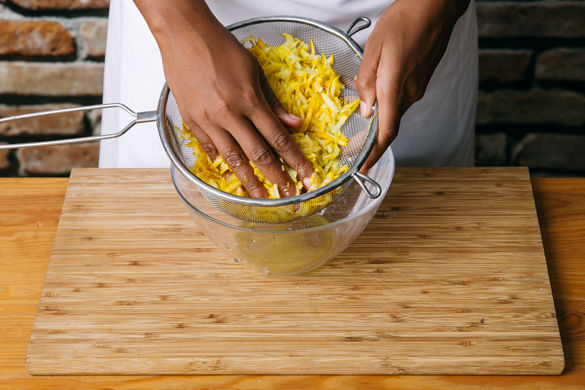Die Zucchini mit einer Küchenreibe grob raspeln, anschließend in einem Sieb möglichst viel Flüssigkeit herausdrücken. Die Petersilienblätter von den Stängeln zupfen und fein hacken.