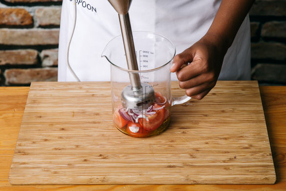 Die Tomaten vierteln und den Strunk entfernen. Die Zwiebel schälen, halbieren und in feine Würfel schneiden. Die 1/2 der Zwiebeln mit den Tomaten, 3EL Olivenöl und 1TL Salz in einem hohen Gefäß mit einem Stabmixer fein pürieren. Mit der Gewürzmischung abschmecken und die Salsa bis zum Servieren kalt stellen.