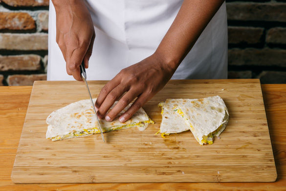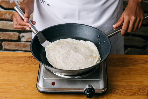 Die erste Quesadilla in der Pfanne ohne Zugabe von Fett 3–4Min. anbraten. Der Käse sollte schmelzen, aber nicht auslaufen. Falls die Tortilla zu schnell dunkel wird, die Hitze runterdrehen. Wenn der Käse geschmolzen ist, die Quesadilla wenden und weitere 2–3Min. braten. Die weiteren Quesadillas ebenso zubereiten.