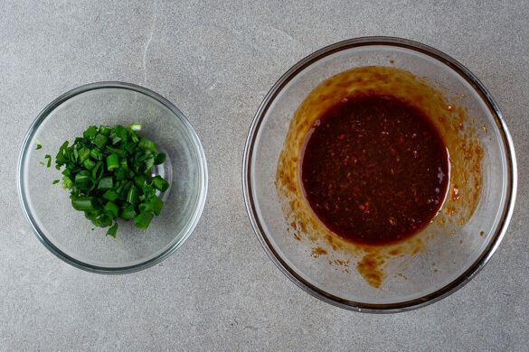 Den Ingwer schälen, fein reiben und mit der Sojasauce, der Hoisinsauce, der Sweet-Chili-Sauce sowie 1EL Wasser verrühren. Den grünen Teil der Lauchzwiebel in grobe Ringe schneiden.