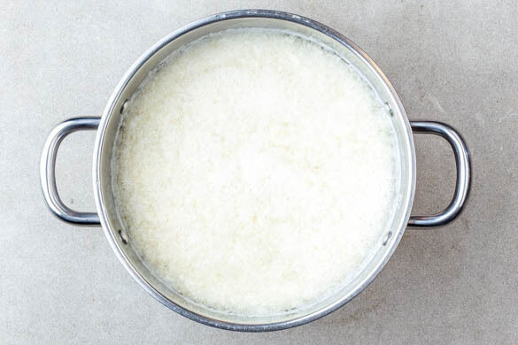 Den Backofen auf 240°C (220°C Umluft) vorheizen. In einem mittelgroßen Topf ausreichend gesalzenes Wasser zum Kochen bringen. Den Blumenkohlreis in das kochende Wasser geben und ca. 5Min. kochen. Den Hartkäse reiben. Den Blumenkohl in ein feines Sieb abgießen und kalt abschrecken, dann über einer Schüssel in ein sauberes Küchentuch geben und die überschüssige Flüssigkeit auspressen.