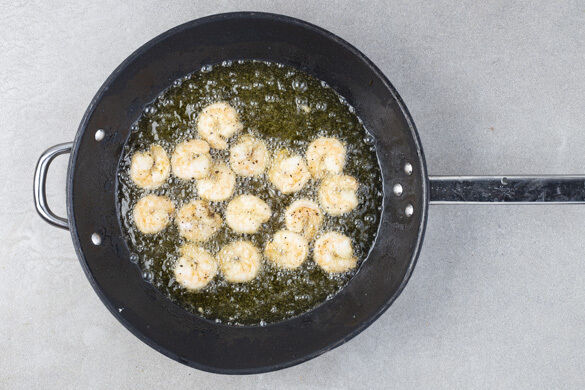 Eine große Pfanne ca. 2cm hoch mit Pflanzenöl befüllen und dieses bei starker Hitze erwärmen. Das Öl ist heiß genug, wenn sich an einem hineingehaltenen Holzlöffel kleine Bläschen bilden. Die Garnelen hineingeben und 2–3Min. braten, bis sie rosa sind. Mit einer Schaumkelle herausheben und auf Küchenkrepp abtropfen lassen. Das Öl bis auf 1EL abgießen.
