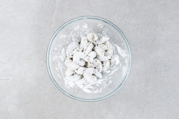 Die Speisestärke mit ½TL Pfeffer und 1 kräftigen Prise Salz verrühren. Die Garnelen in einem Sieb kalt abspülen, trocken tupfen und mit der Stärke vermengen.