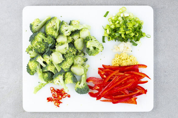Den Knoblauch, den Ingwer und die Peperoni in der Pfanne bei mittlerer bis starker Hitze ca. 1Min. anbraten. Den Brokkoli und ¾ der Lauchzwiebeln zugeben und ca. 3Min. mitbraten, dann die Paprika zugeben und das Gemüse weitere 2Min. braten. Mit der Teriyaki-, der Sojasauce und 100–150ml Wasser ablöschen und mit Salz und Pfeffer würzen.
