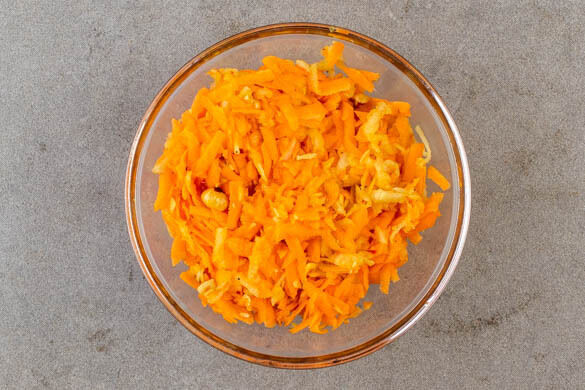 Inzwischen die Karotten ggf. schälen und grob reiben. Den Apfel vierteln, entkernen und ebenfalls grob reiben. Die Haselnüsse grob hacken und in einer mittelgroßen Pfanne bei mittlerer Hitze in 1–2Min. goldbraun anrösten. Vorsicht, sie können schnell zu dunkel werden. Zum Abkühlen aus der Pfanne nehmen und beiseitestellen.