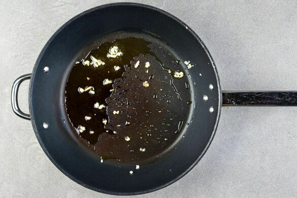 Den Knoblauch schälen und grob würfeln, dann in derselben Pfanne mit 2EL Olivenöl bei mittlerer Hitze ca. 30Sek. anbraten.