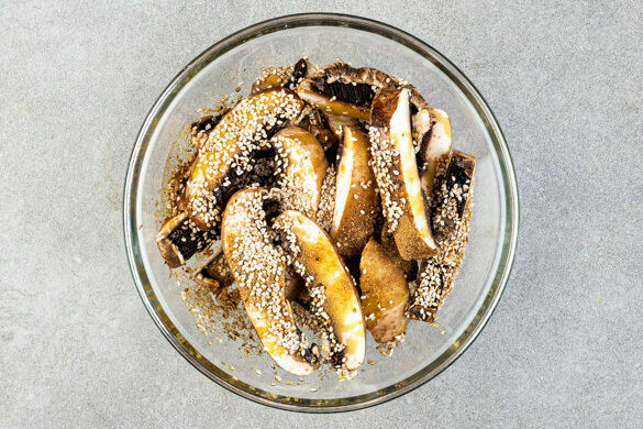 Die Pilze in ca. 1cm dicke Streifen schneiden und mit 2EL Olivenöl, der Gewürzmischung und dem Sesam vermengen.