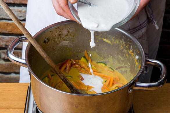 Das Gemüse mit der Kokosmilch und 100ml Wasser ablöschen und die ½ des Brühgewürzes unterrühren.