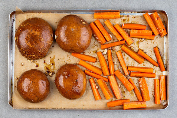 Die Pilze und die Karotten auf einem mit Backpapier ausgelegten Backblech verteilen und mit dem Knoblauch, 1EL Olivenöl, 1EL Balsamicoessig und je 1 kräftigen Prise Salz und Pfeffer vermengen. Die Pilze so auf dem Backblech platzieren, dass die Lamellen nach unten zeigen. Das Gemüse ca. 15Min. im Ofen backen, bis es weich wird. Die Pilze nach der Hälfte der Zeit wenden.